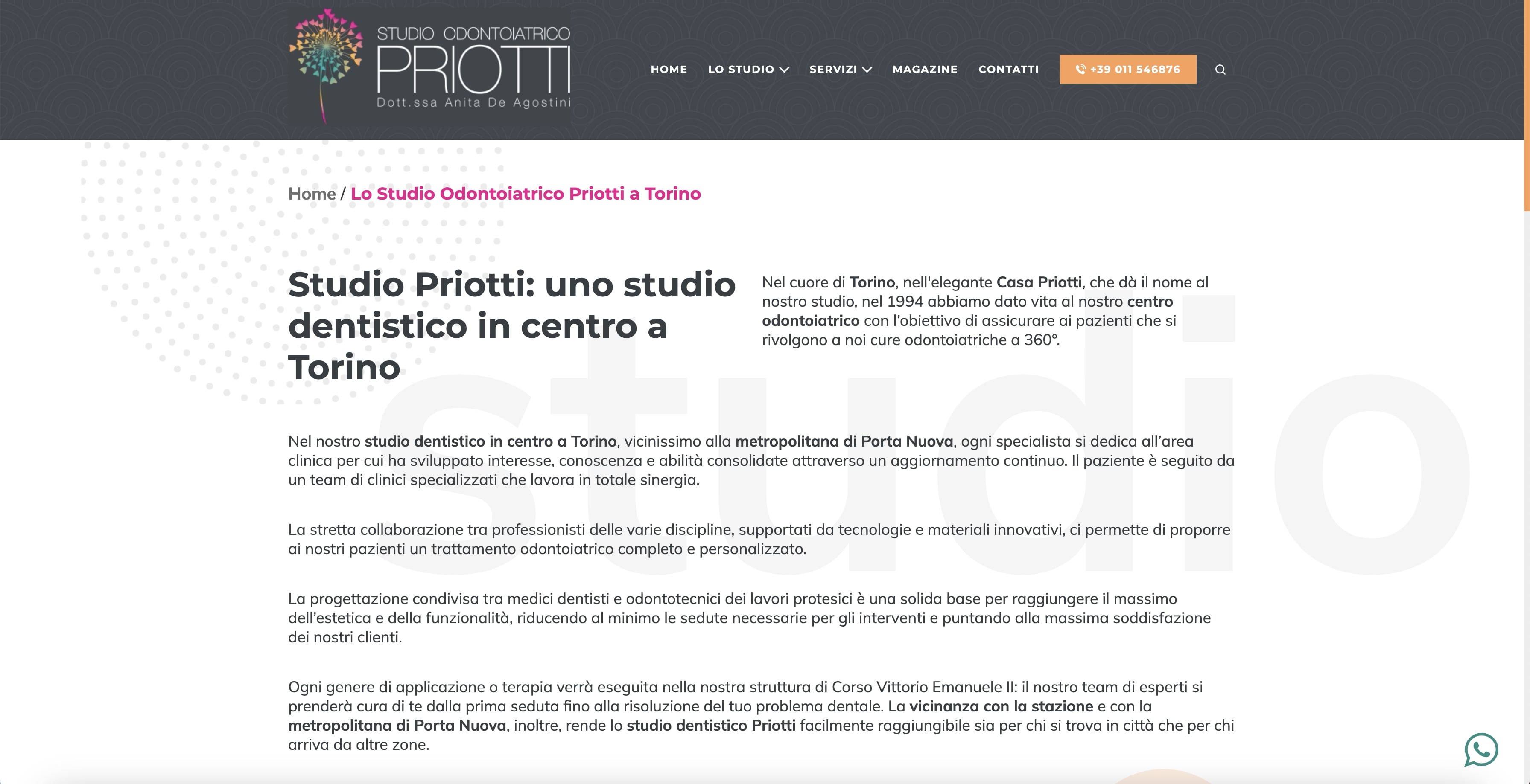 Lo Studio Odontoiatrico Priotti si trova a Torino, in Corso Vittorio Emanuele II, ed è specializzato nell’approccio multidisciplinare all’odontoiatria. Grazie alla sinergia di diverse figure professionali ti offriremo la soluzione più efficace per risolvere i tuoi problemi dentali. Il punto di partenza sarà ovviamente l’ascolto delle necessità e delle esigenze del paziente. Dopodiché, decideremo insieme il miglior trattamento da applicare.